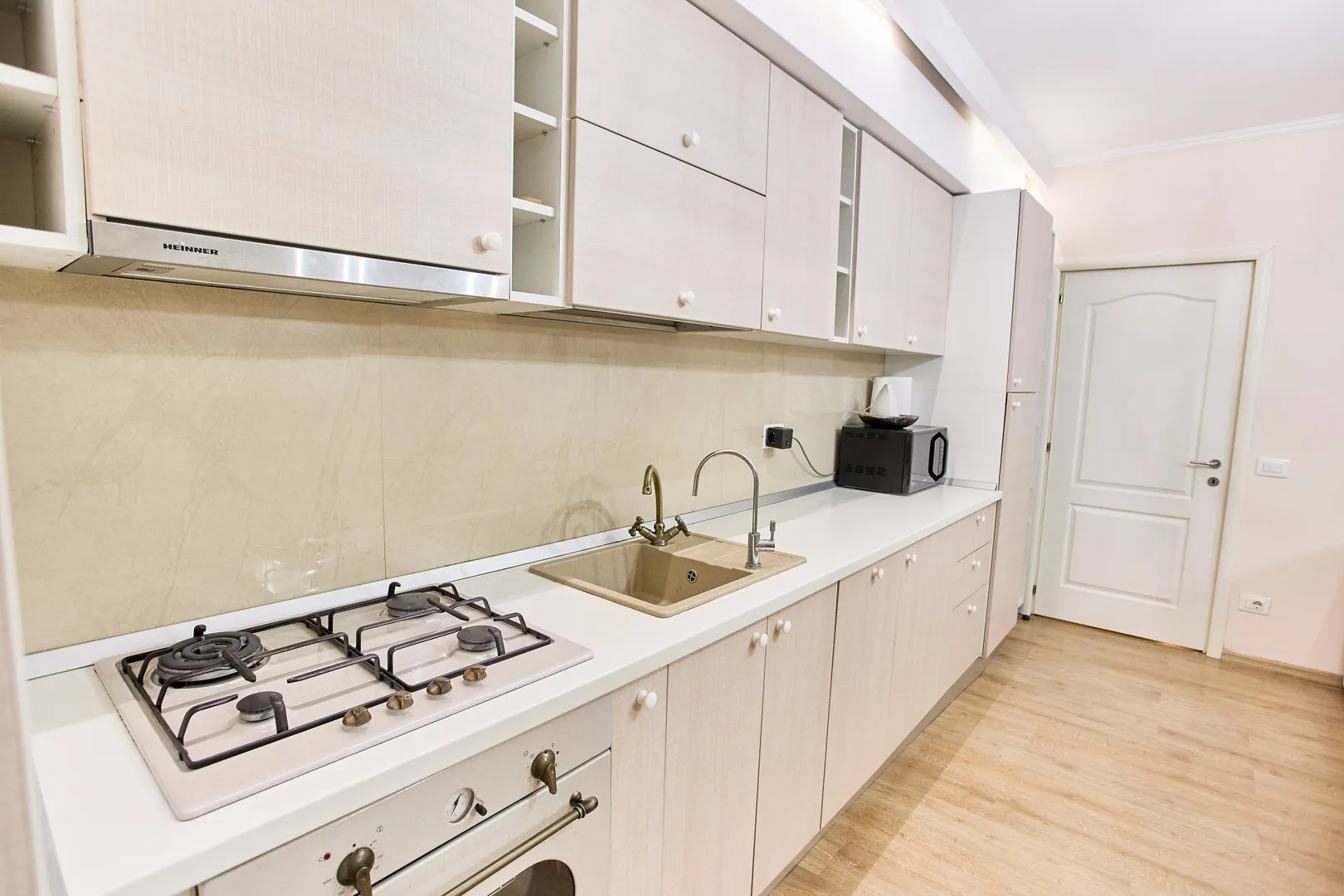 Living open-space generos, decorat în tonuri calde, cu canapea mare, zonă de dining și acces direct către bucătăria lungă, complet echipată perfect pentru cei care gătesc des și preferă spațiile ordonate.