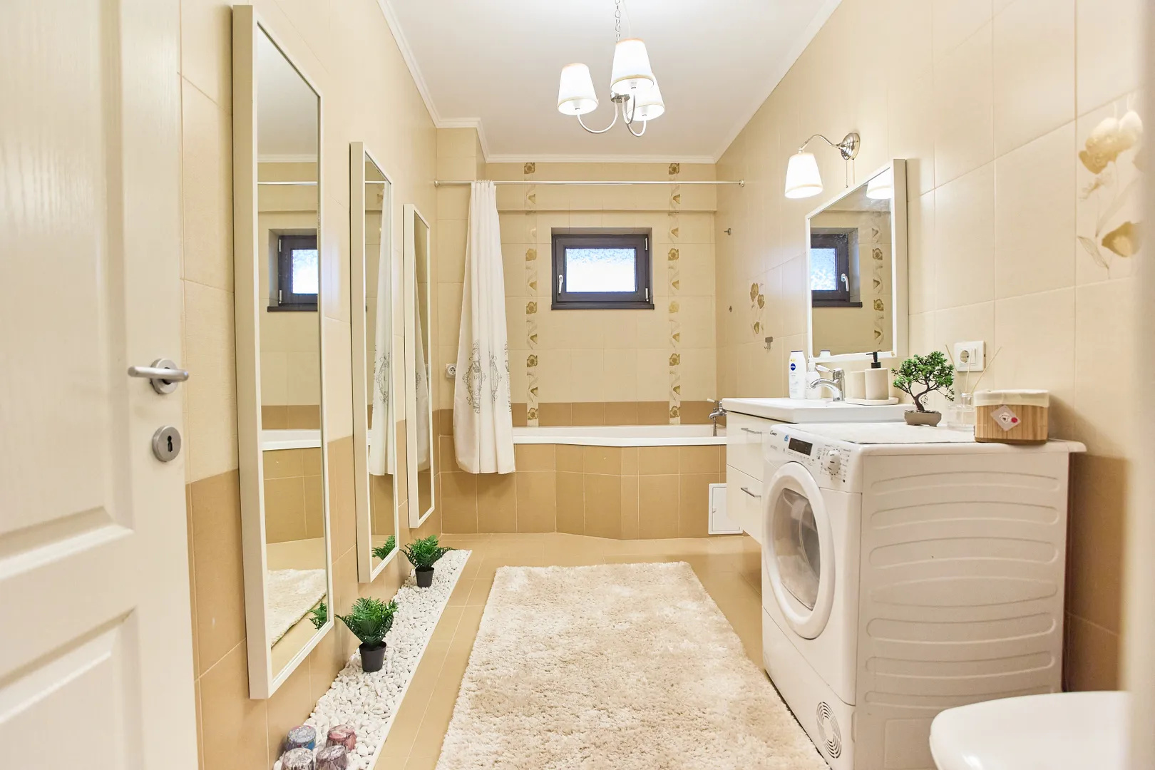 Baie cu geam, cadă mare, mașină de spălat, oglinzi înalte și spații de depozitare bine integrate.