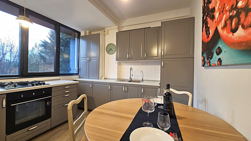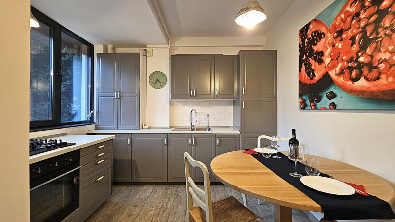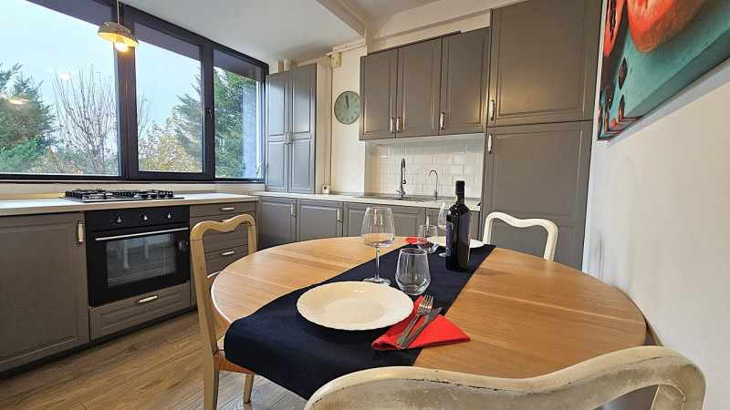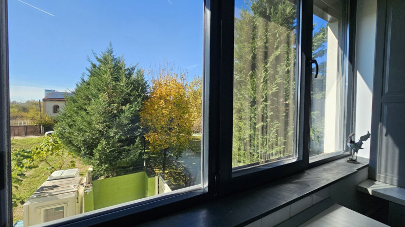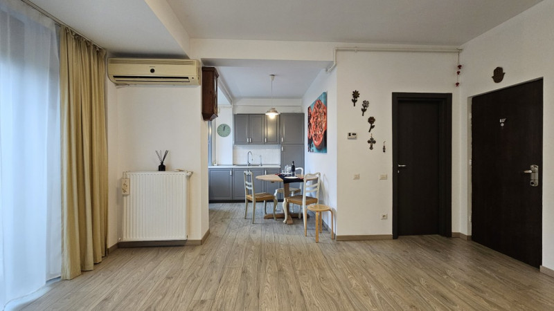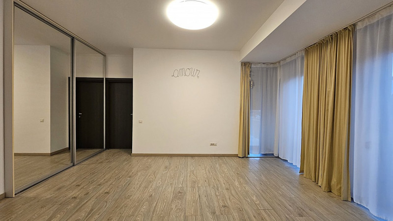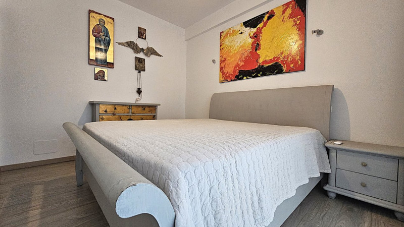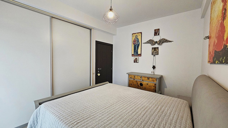 Detaliile fac diferența: centrala termică Ariston nouă, aerul condiționat Vortex, jaluzelele acționate electric, finisajele de calitate și dressingurile spațioase din living și dormitor. Bucătăria IKEA este complet mobilată și utilată, cu toate electrocasnicele necesare — combină frigorifică, aragaz Ariston, cuptor, hotă, chiuvetă inox, filtru de apă 3M și mașină de spălat rufe LG.