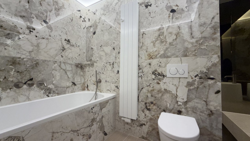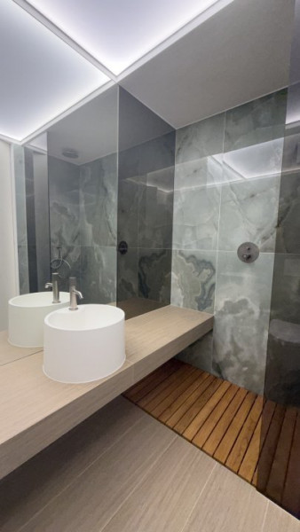 Baile sunt foarte elegante, cu finisaje premium – faianță cu aspect de marmură verde, lavoare pe blat (tip vas), oglinzi mari și duș walk-in cu pardoseală din lemn. Iluminarea este modernă, cu barisol.