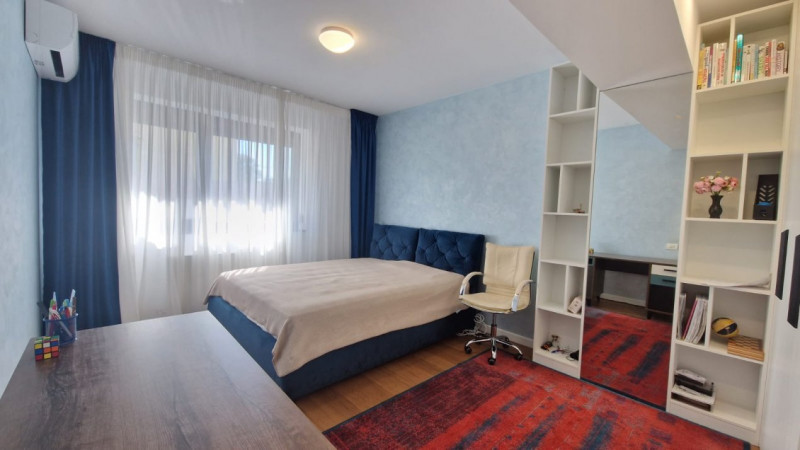 Apartamentul dispune de finisaje de o calitate premium, parchet triplu stratificat, geamuri termopan din aluminiu, aer conditionat in camere, centrala proprie.