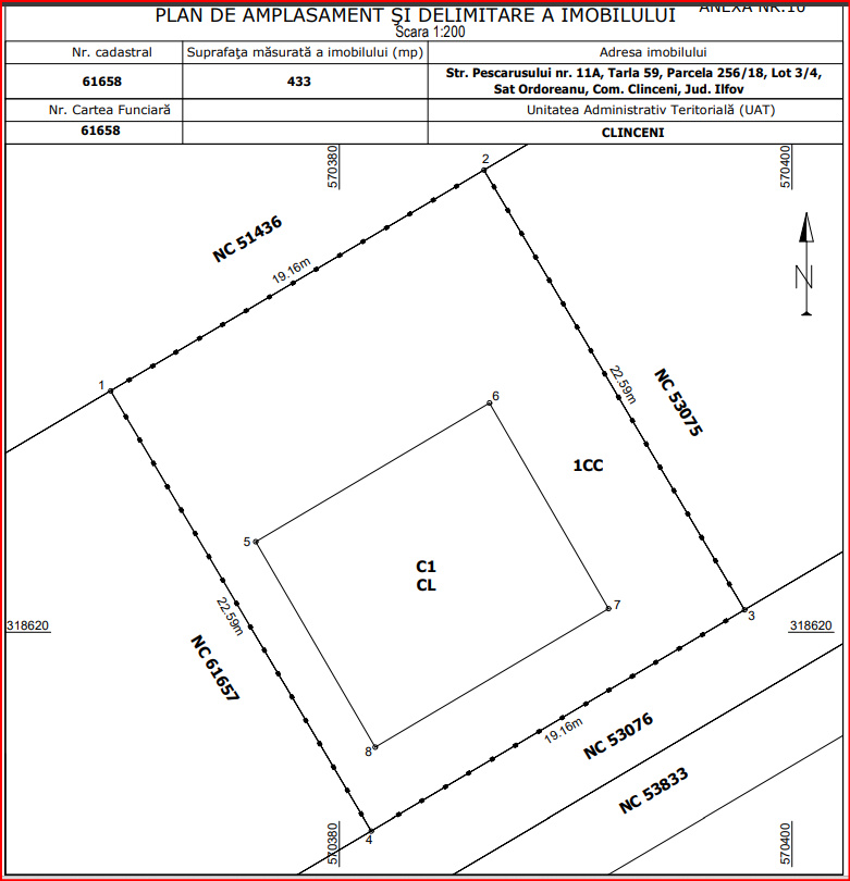 Terenul are o suprafață de 443 mp și o deschidere stradală de 20 ml.