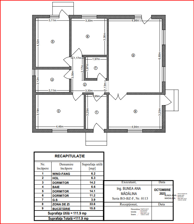 Compartimentare: 4 camere decomandate, bucatarie și 2 băi, cu o suprafață utilă de 112 mp și amprentă la sol de 126 mp.