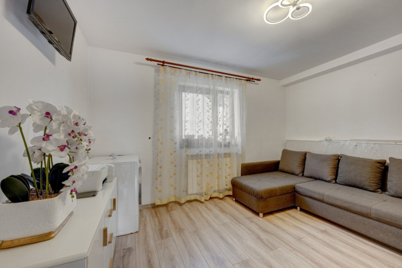 Interior luminos, bucatarie inchisa, living mare, spatii de depozitare, constructie proprie.