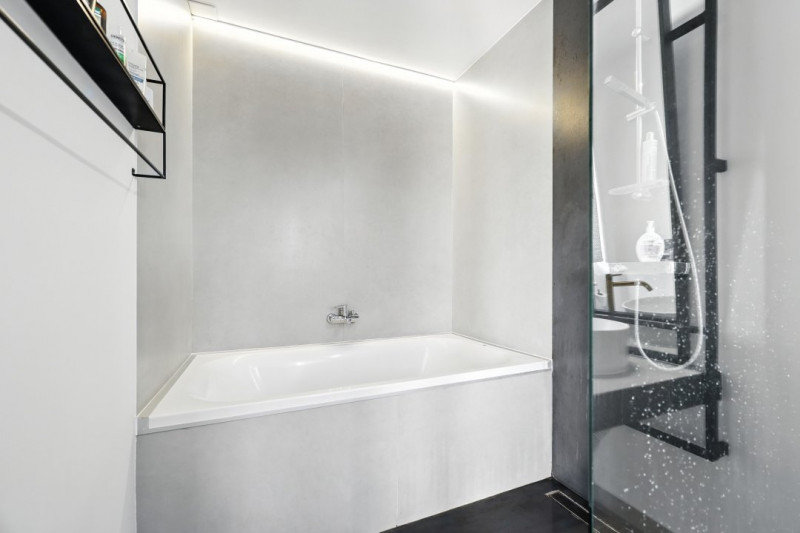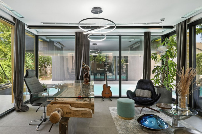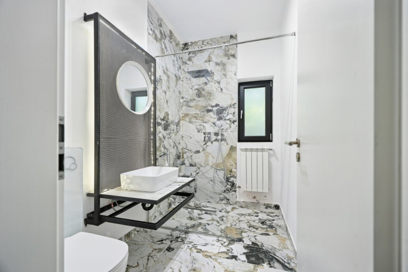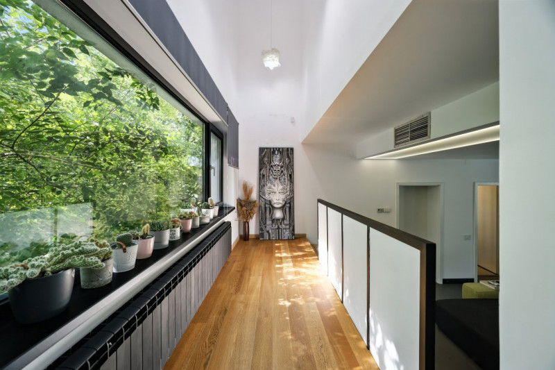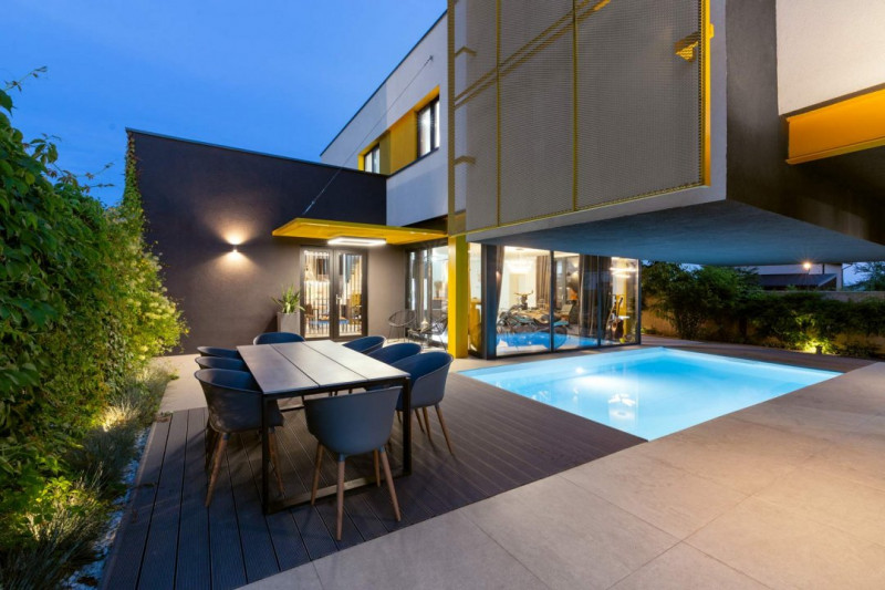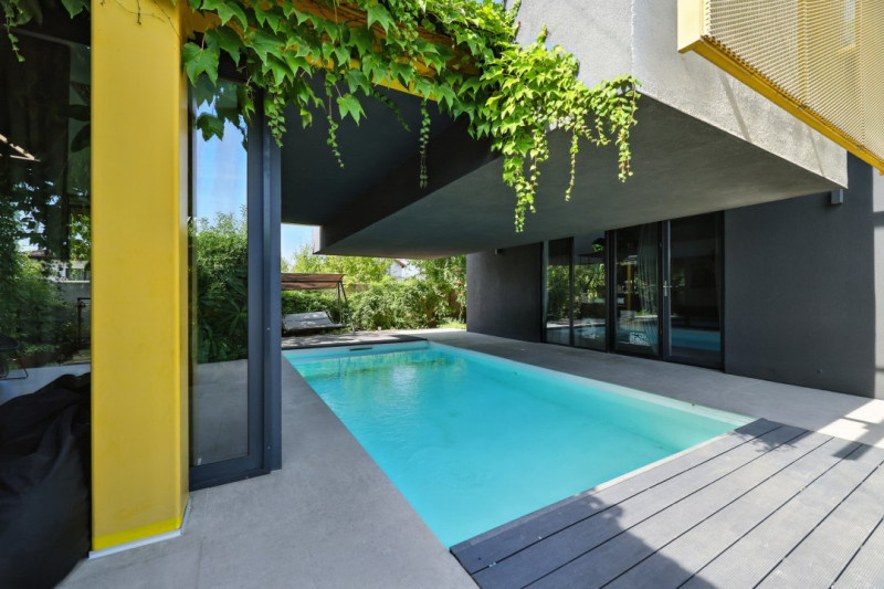 Piscina incalzita (21.80 mp) pozitionata strategic intre cele doua corpuri, ofera intimitate dar si o priveliste relaxanta din interiorul casei.
