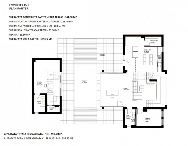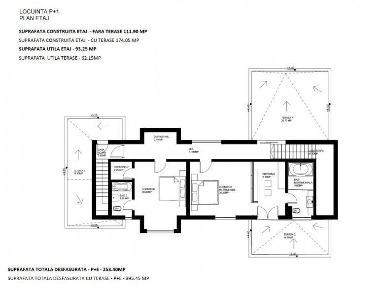 Suprafata utila este de 202,5 mp la care se adauga cele 3 terase de la etajul 1 cu o suprafata de 62.15 mp+ terasa de la parter de 79.90 mp.