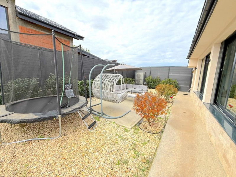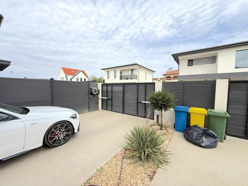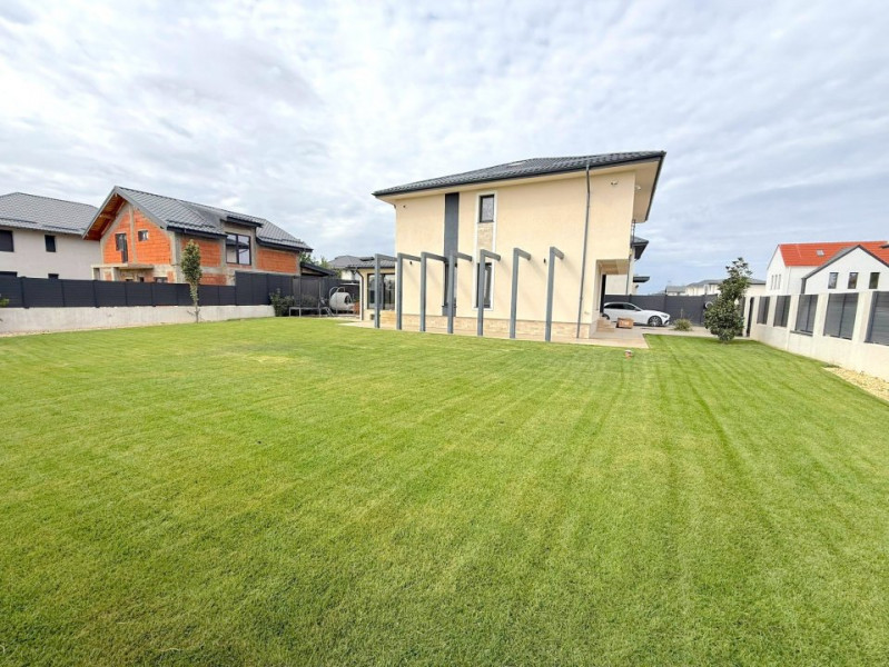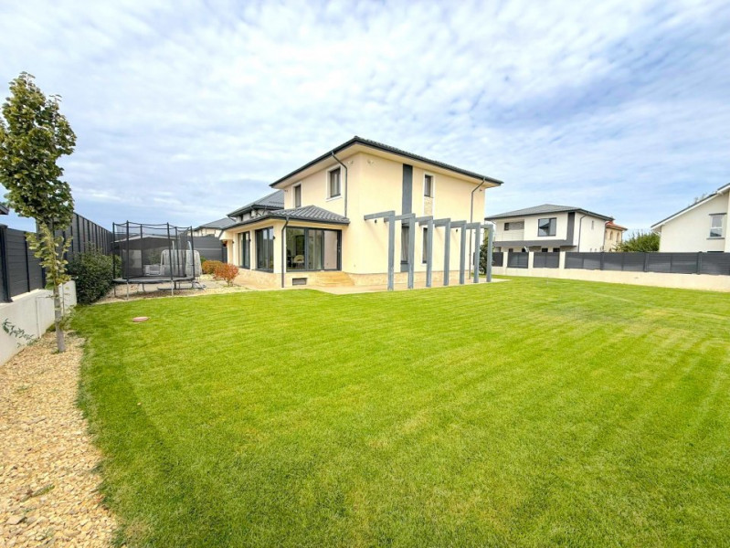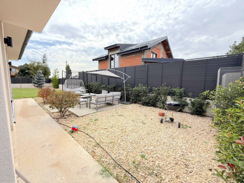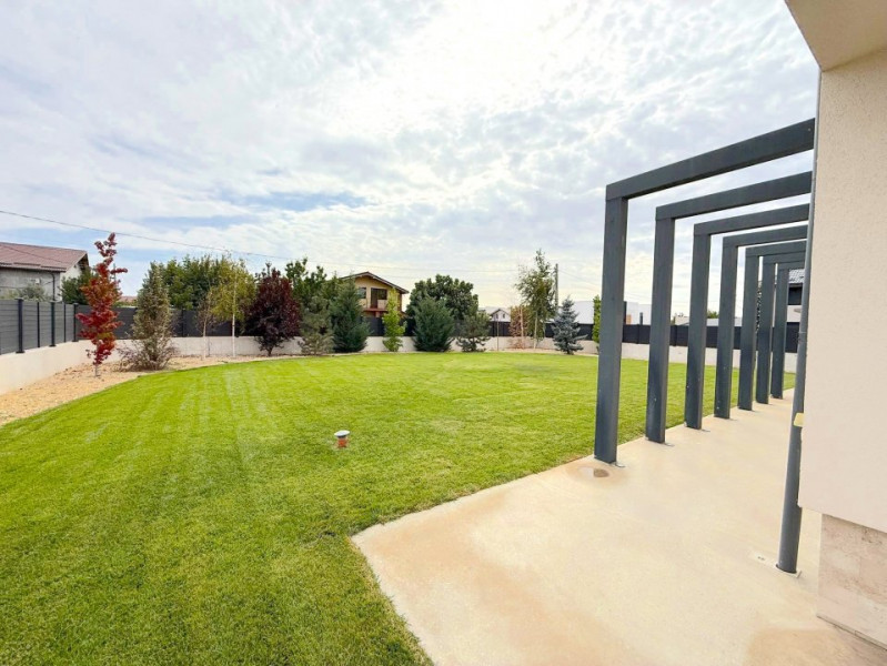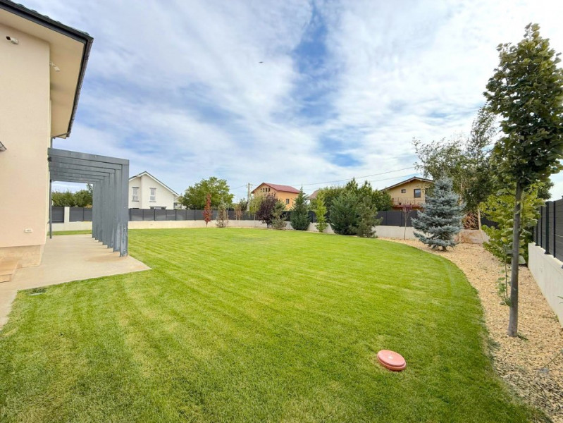 Grădina este complet amenajată, cu gazon rulou, sistem automat de irigații și peisagistică atent realizată, incluzând plante, piatră decorativă și pomi. Vila beneficiază și de o terasă exterioară amenajată, videointerfon, sistem de alarmă și supraveghere, precum și un dedurizator combinat cu osmoză inversă pentru apă potabilă.