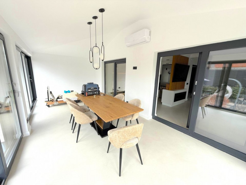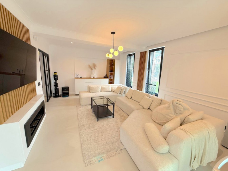 Vă propunem spre vânzare o vilă cu design deosebit, finalizată și pregătită pentru mutare imediată, complet mobilată cu mobilier pe comandă cu fronturi din MDF și utilată cu electrocasnice moderne. Proprietatea dispune de 5 camere, 3 băi, o terasă închisă și încălzită, cameră tehnică și finisaje premium.