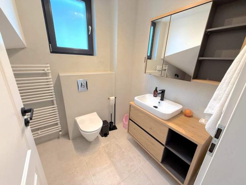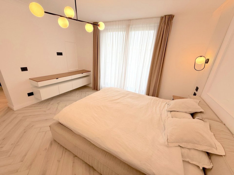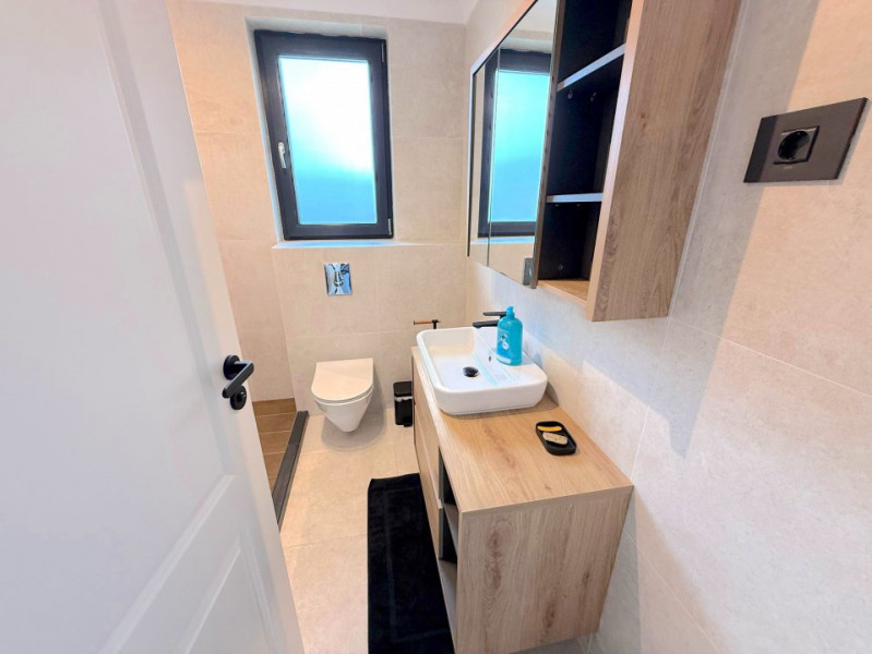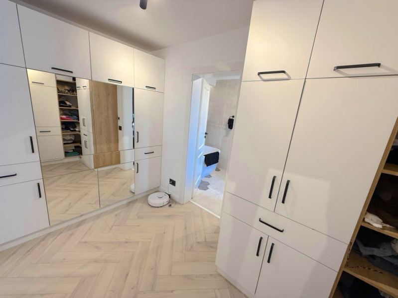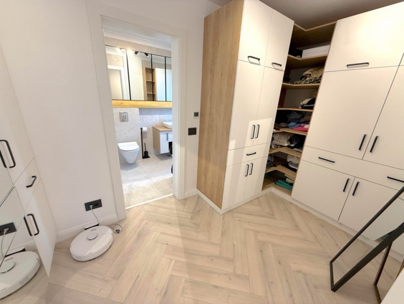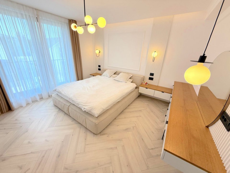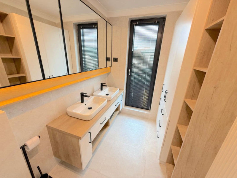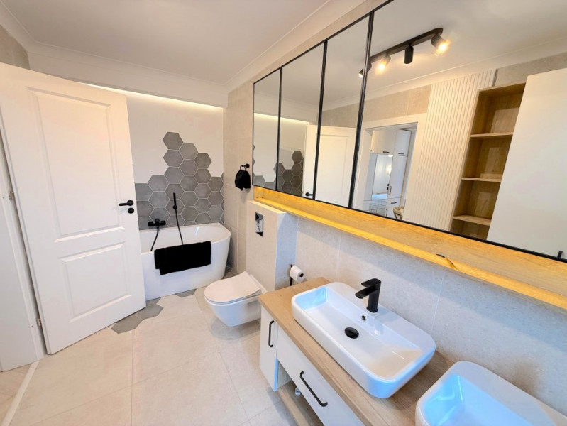 Baia matrimonială este dotată cu o cadă freestanding, adăugând un plus de eleganță și rafinament.