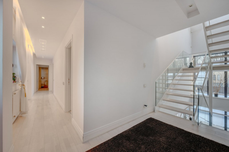 Situata intr-un complex rezidential elegant si intim, cu acces direct din soseaua principala si acces imediat la DN 1 si A 0. Vila contemporana, cu 5 dormitoare si bai en-suite, bucatarie mare, living superb cu scara interioara si suprafete vitrate mari, ideala pentru o familie ce isi doreste statut, spatii ample si prestigiu. Lot mare, amenajat peisagistic, piscina, foisor recent amenajat, sistem de irigatie, vedere la padure. Interior foarte spatios, spatii de depozitare, dressing-uri, garaj cu acces direct in casa, gym, panouri fotovoltaice de 25 kw, semineu.