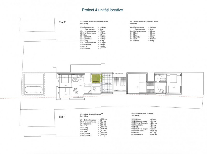 4 unități de locuințe cu grădini incluse, 3 camere fiecare+ loc de parcare