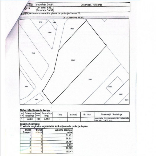 Terenul are o suprafață totală: 3.451 mp cu deschidere de 40 ml la stradă, intravilan, destinație construcții. Regim tehnic (conform certificatului de urbanism):POT max.: 35%, CUT max.: 1, Regim de înălțime: P + 2 etaje.