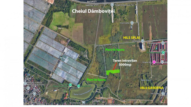 Poziționat excepțional, chiar între două parcuri aflate în lucru- unul prin mărirea suprafeței verzi a parcului deja existent- Balta Floarea Popeștiului - iar celălalt fiind un parc nou, de tip urban, în curs de amenajare, terenul de 5000mp are deschidere către 2 drumuri. Cele două deschideri la stradă au lungimi diferite, dată fiind configurația neregulată a parcelei- o deschidere de 28 ml și o alta de 39 ml. Cele două străzi se află momentan în lucru și vor conecta atât Cheiul Dâmboviței cu șoseaua Leordeni cât și Leordeni cu zona Viscofil.